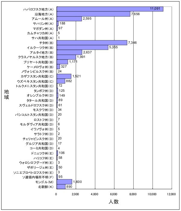| シベリア抑留死亡者の州・地方・共和国別集計人数(2010年1月現在、登載総員46,303名) |